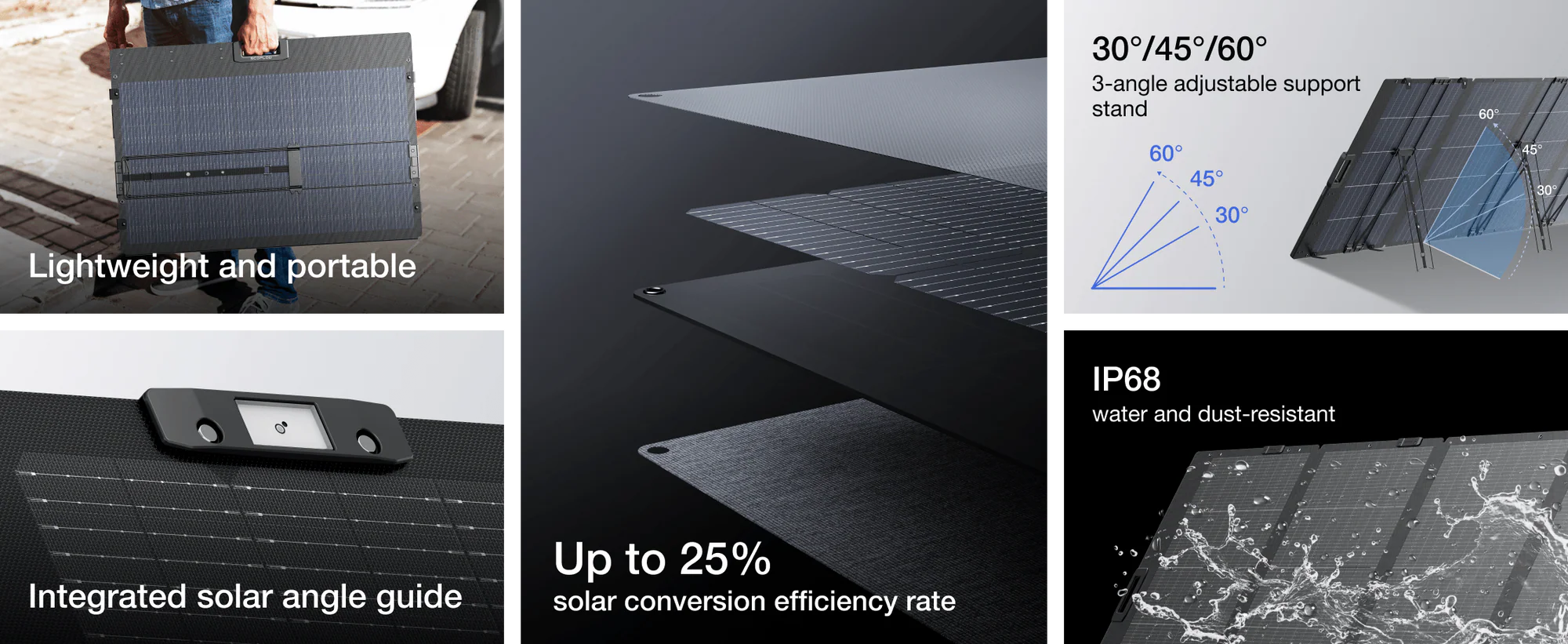 უაღრესად ეფექტური – მზის პანელები ეს ერთი ცალი, დასაკეცი 400 ვატიანი მზის პანელი შესანიშნავია სახლისთვის, კემპინგისა და ქსელის გარეთ საცხოვრებლად. მაღალი მზის გამომუშავებით და გაუმჯობესებული ეფექტურობის რეიტინგით 23%, შეგიძლიათ დატენოთ თქვენი პორტატული ელექტროსადგური კიდევ უფრო სწრაფად, ვიდრე ადრე. თვითმმართველი – დამცავი ქეისი მოხერხებულად იკეცება სტაბილურ სადგამში, რომელიც რეგულირდება 40-80°-მდე, რაც საშუალებას აძლევს მოქნილ მზის პანელს დაიჭიროს ყველაზე მეტი სხივები. გამძლე და მსუბუქი – დამზადებულია მოქნილი EVA-ს და გამძლე ბოჭკოვანი მინის ფენებისგან, რომელიც აერთიანებს მოქნილი მზის პანელების მრავალფეროვნებას ხისტი პანელების სიძლიერესთან. მხოლოდ 16 კგ იწონის, აქვს მსუბუქი დიზაინი და ჩაშენებული მხრის სამაგრი მას იდეალურს ხდის გარე ავანტიურისტებისთვის. წყალგამძლე – თითოეული მონოკრისტალური სილიკონის უჯრედი დაფარულია ETFE ფირით, რომელიც იცავს ნამსხვრევებისგან, ჭუჭყისა და წყლისგან. IP68 წყალგაუმტარი რეიტინგით, ეს პორტატული მზის პანელი უსაფრთხოდ მუშაობს ყველა სახის ამინდში, იდეალურია კემპინგისა და სახურავზე გამოყენებისთვის. კეცვადი და პორტატული – კომპაქტური დიზაინით, ეს 400 ვტ მზის პანელი ზოგავს ადგილს მოგზაურობისა და შენახვისთვის. მარტივად დაყენებადია თქვენი პორტატული ელექტროსადგურის დასატენად. როდესაც მზად იქნებით წასასვლელად, სწრაფად ჩამოშალეთ პანელი ქვევით და მოათავსეთ დამცავ ყუთში, თქვენი ფურგონითა ან მანქანით წასაღებად.