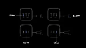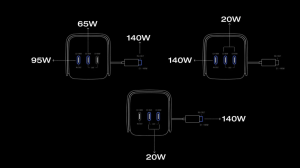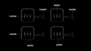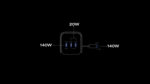 • მრავალმოწყობილობაზე დამტენი სწრაფი დატენვა: საერთო სიმძლავრე (4 პორტი): 300 W, 1 × 140 W გასაშლელი USB-C კაბელი, 1 × 140 W USB-C პორტი, 2 × 65 W USB-C პორტი.