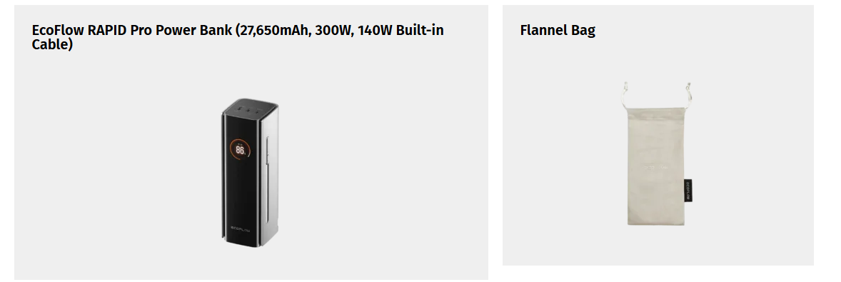 1. როდესაც მომხმარებლები ყიდულობენ ნებისმიერ EcoFlow Power Bank-ს, მათ ასევე შეუძლიათ შეიძინონ შესაბამისი Power Bank-ის აქსესუარები ფასდაკლებულ ფასებში.