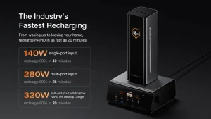 • სწრაფი დატენვის სიჩქარე: 20 წთ 80%-მდე დატენვისთვის EcoFlow RAPID Pro 320 W დამტენი სადგურის გამოყენებით.²