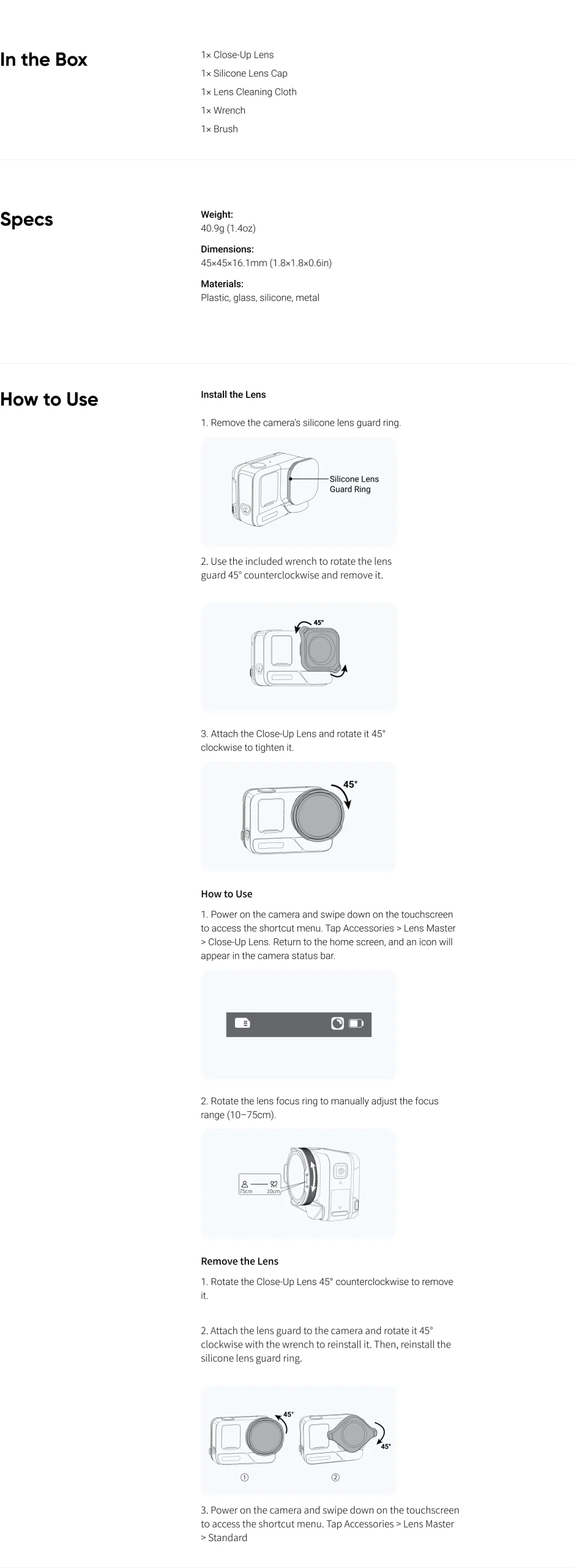 უბრალოდ მოატრიალეთ ლინზის ფოკუსირების რგოლი, რათა ფოკუსური მანძილი 10 სმ-დან 75 სმ-მდე დაარეგულიროთ.