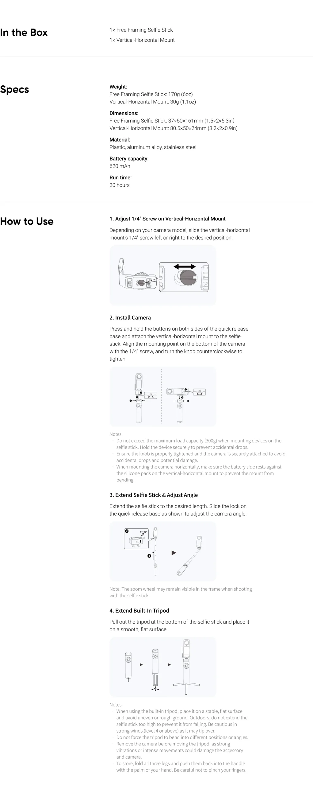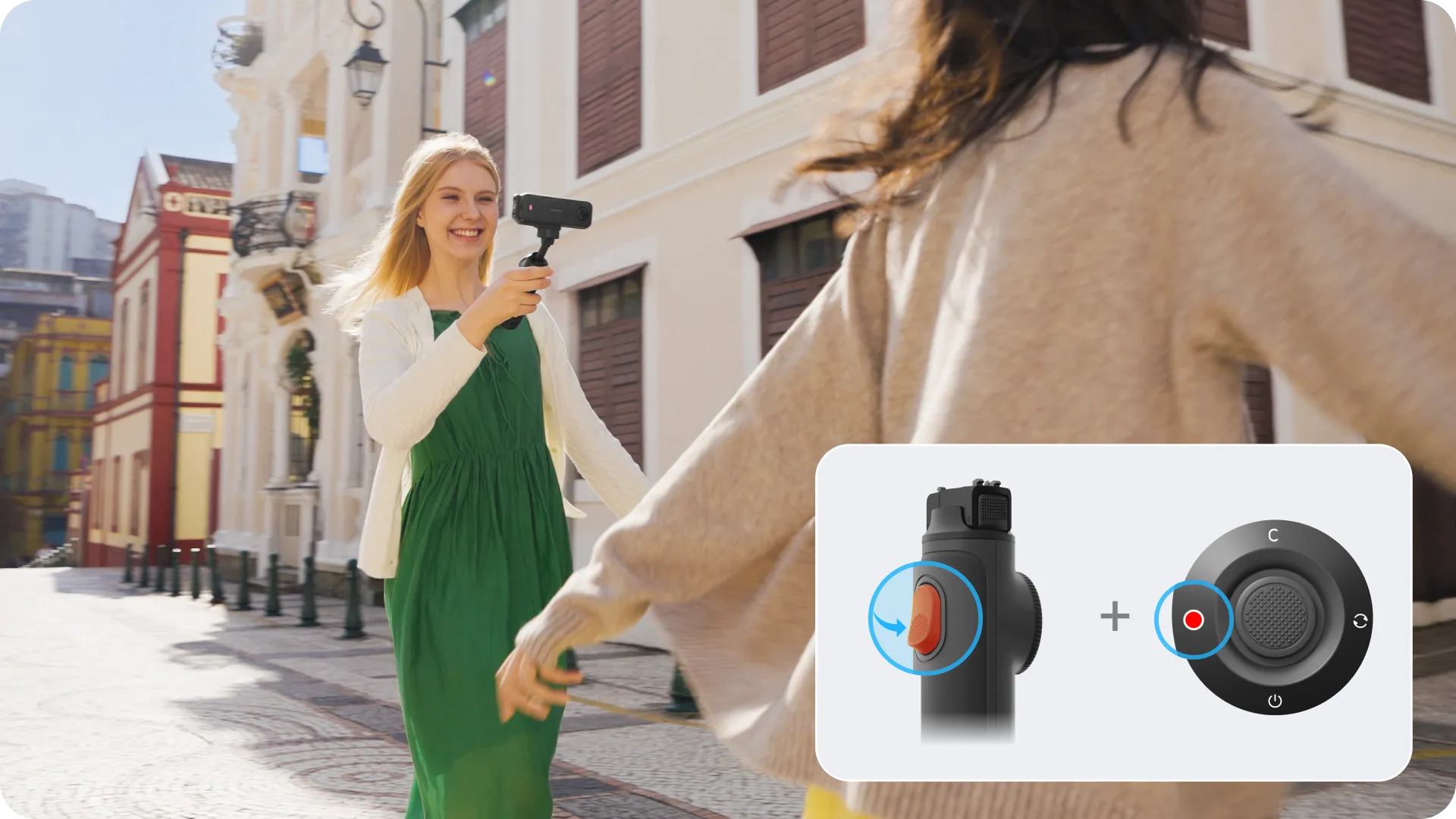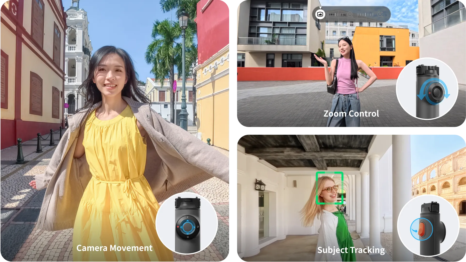 - Control recording, framing, tracking, and more directly from the selfie stick’s joystick and buttons. No need to touch the camera.
